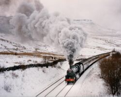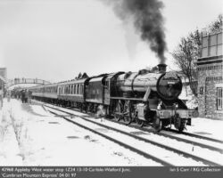On a bitterly cold day with heavy over-night snow falls on the ground 2968 set off from Carlisle with her nine coach 355 tons gross train to do battle with the Long drag southbound over the S&C and Ais Gill.